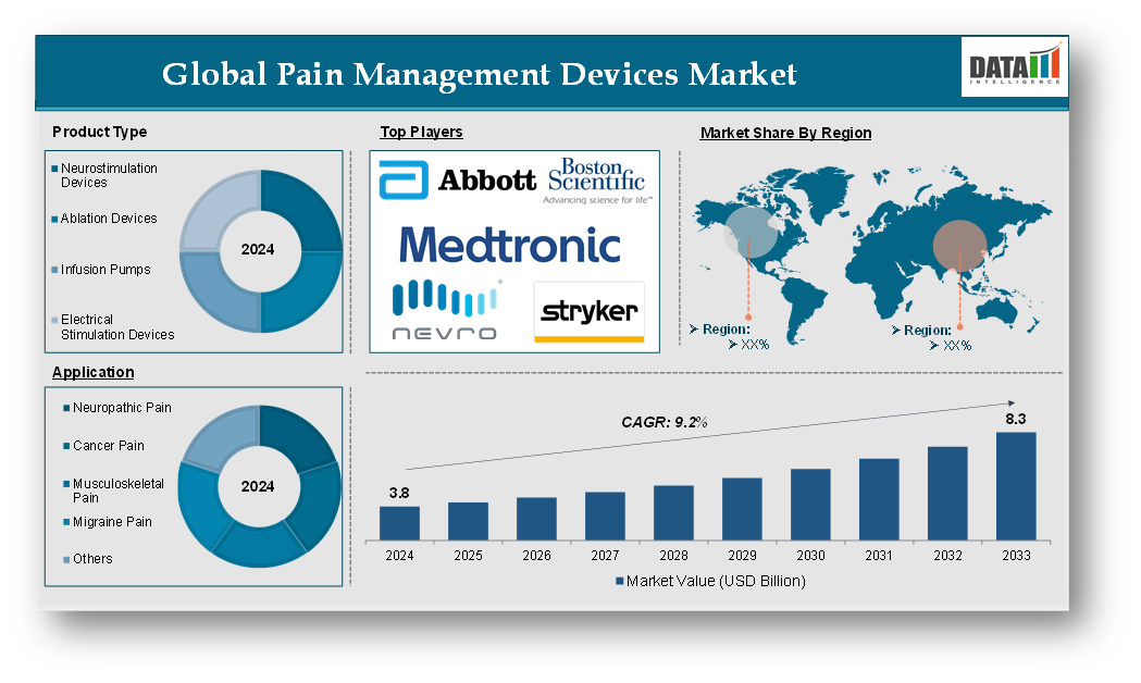 AUSTIN, TX, UNITED STATES, October 6, 2025 /EINPresswire.com/ -- According to DataM Intelligence, the pain management devices market was valued at US$ 3.8 billion in 2024 and is projected to reach US$ 8.3 billion by 2033, growing at a CAGR of 9.2% during the forecast period of 2025-2033. The marketโ€™s expansion is primarily fueled by the rising prevalence of chronic pain conditions, technological advancements in neurostimulation and wearable devices, and increasing patient preference for non-invasive treatment options. Neurostimulation devices, particularly spinal cord stimulators and deep brain stimulation systems, are currently leading the market, with North America emerging as the dominant region due to the presence of major players like Medtronic, Abbott, and Boston Scientific and strong R&D infrastructure.